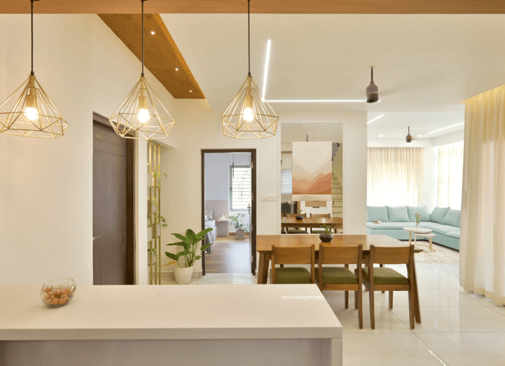 The ample use of white, along with wall decorations like metallic frame art and abstract paintings, was intended to give the Twin Villa an original quality without excessive additions. The goal was to use simplicity and a few unique features to elevate the space. Abstract art canvases were incorporated to transform the ambiance and create an inspirational setting. These were contrasted against neutral shades and customized solid wood furniture, which featured laminates in the same color. The sofa upholstery, in a warm blue tone, perfectly complemented the other elements in the room. White curtains and blinds were chosen to enhance the sense of openness, making the space feel larger, especially in the morning light.